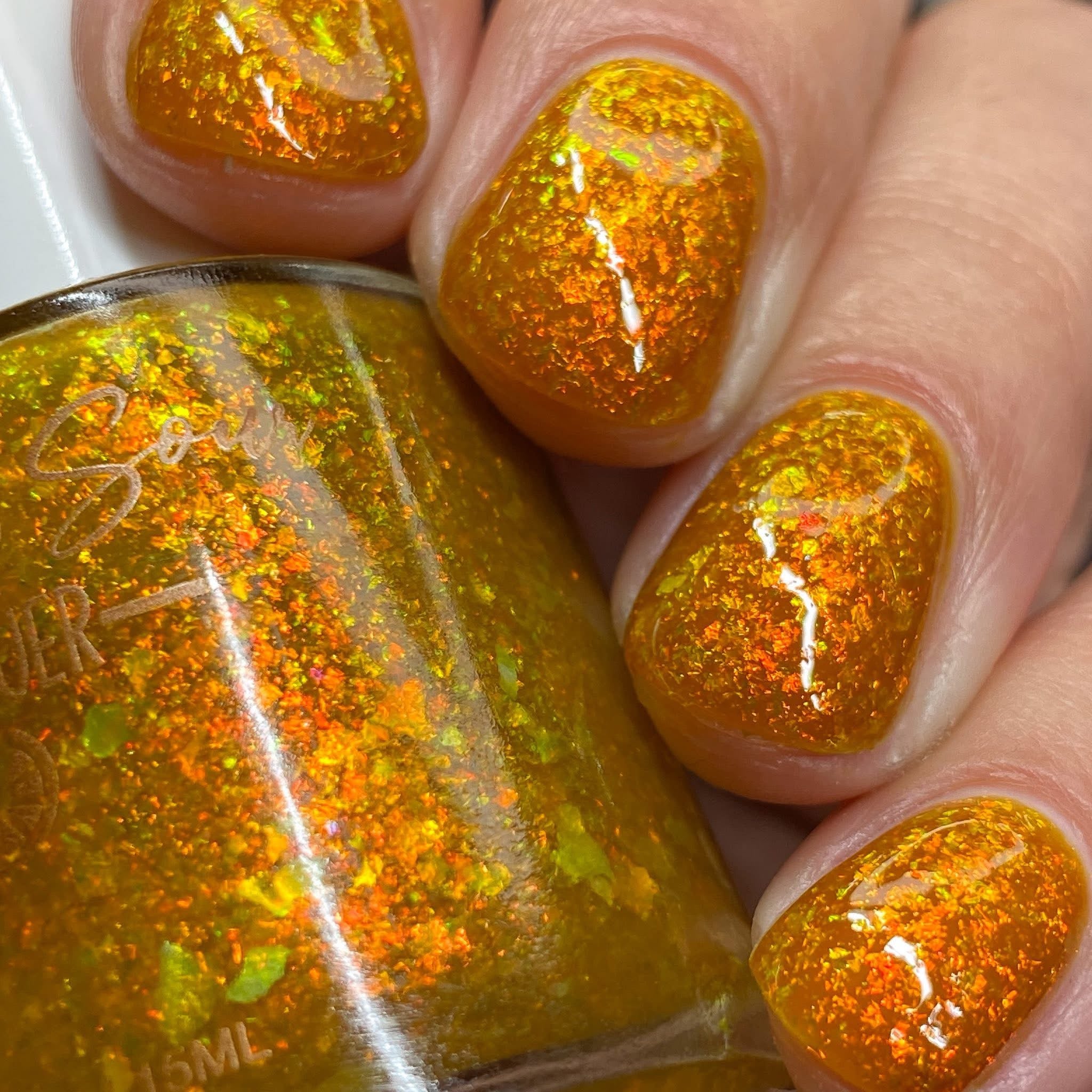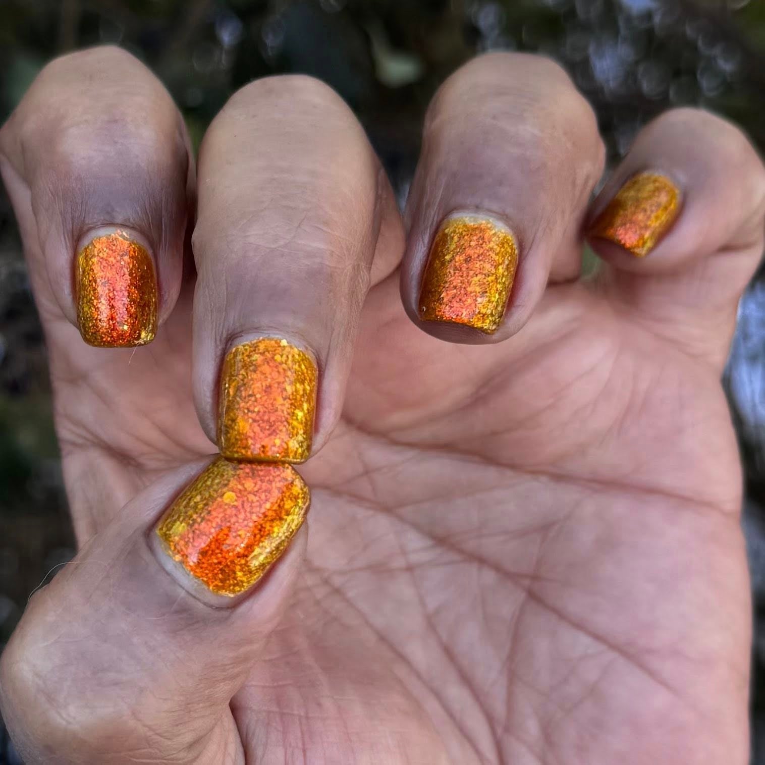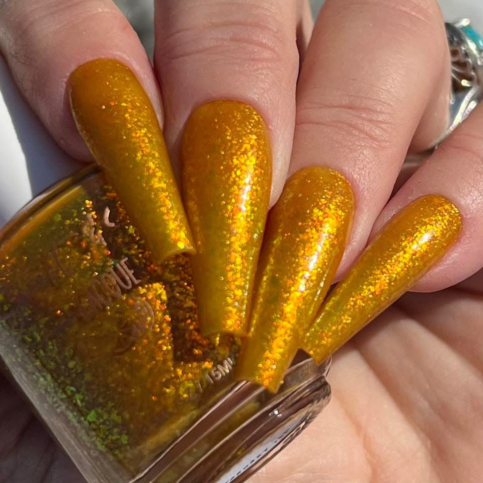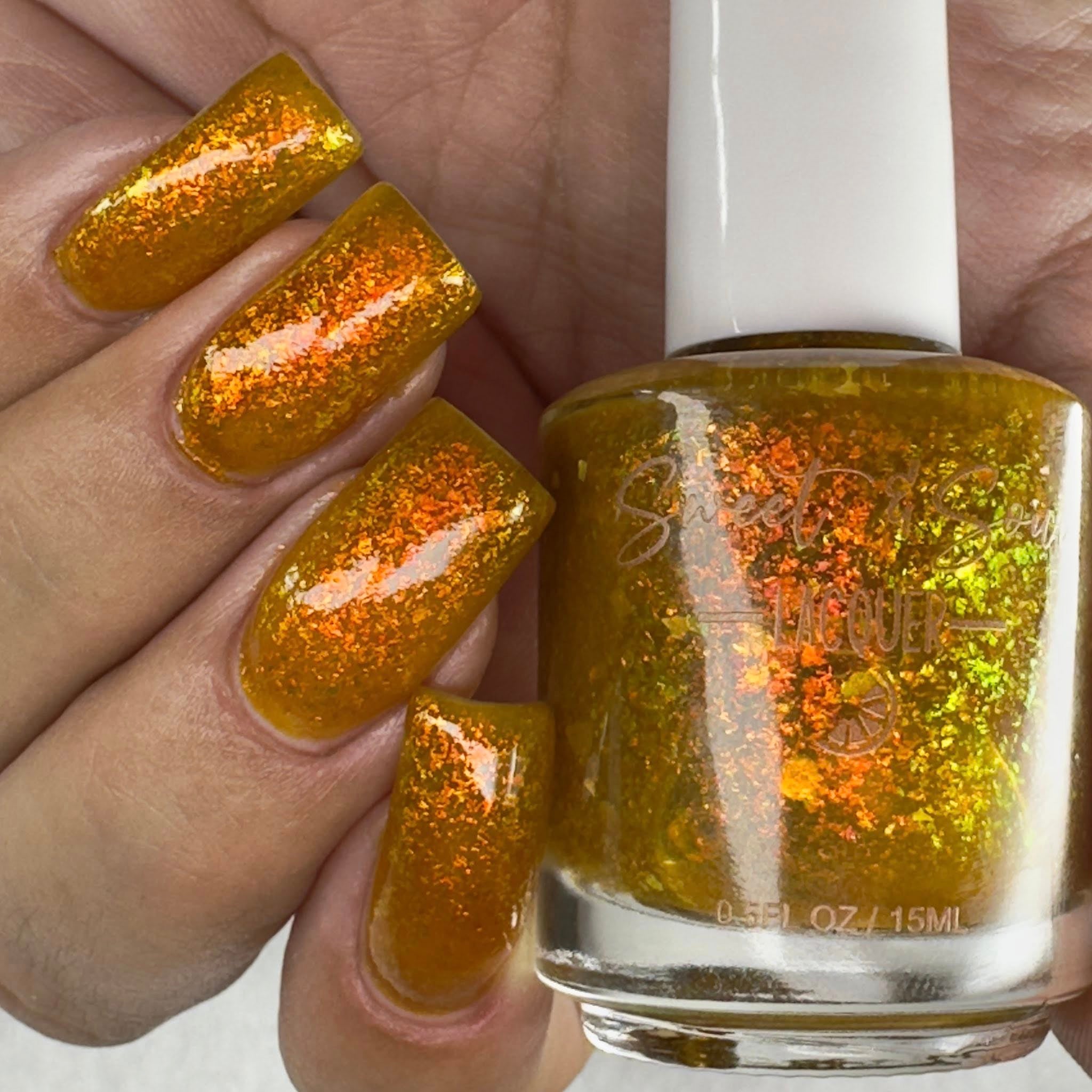 Group custom for Prugly Polish Pals - golden orange jelly with orange/gold/green iridescent flakes -- Join group for discount code! https://www.facebook.com/groups/1879251045863637