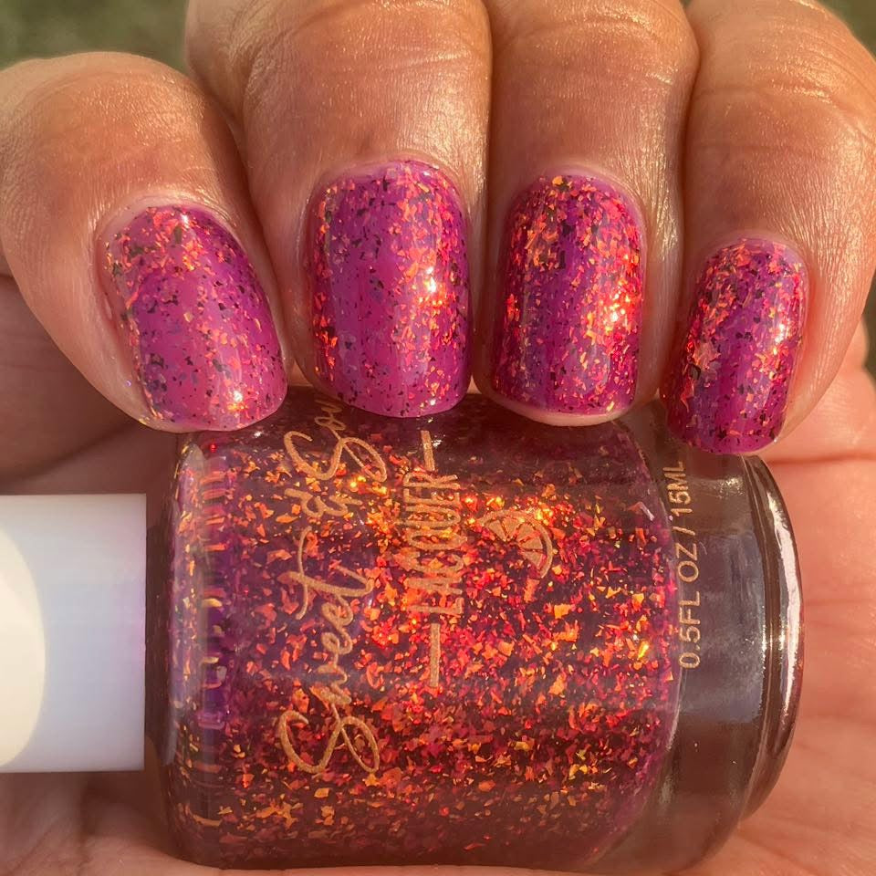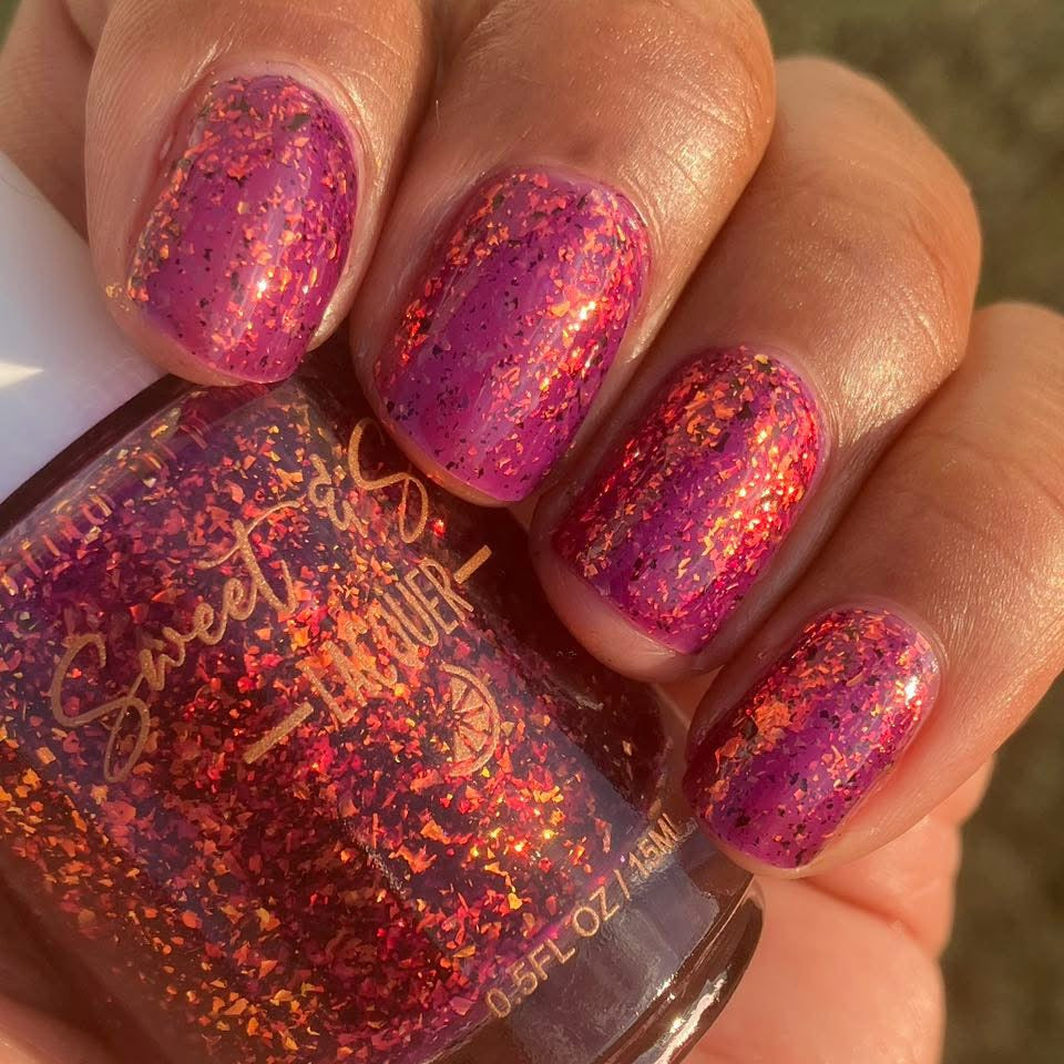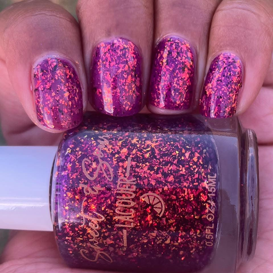 DISCLAIMER: DUE TO VARIATIONS OF SCREEN RESOLUTIONS INCLUDING, BUT NOT LIMITED TO: COLORS AND BRIGHTNESS ON COMPUTERS AND MOBILE DEVICES, THE ACTUAL COLOR OF THE POLISH MAY BE SLIGHTLY DIFFERENT THAN WHAT YOU SEE. SWEET & SOUR LACQUER POLISHES ARE CREATED IN SMALL BATCHES. EACH INDIVIDUAL BATCH MAY VARY SLIGHTLY.