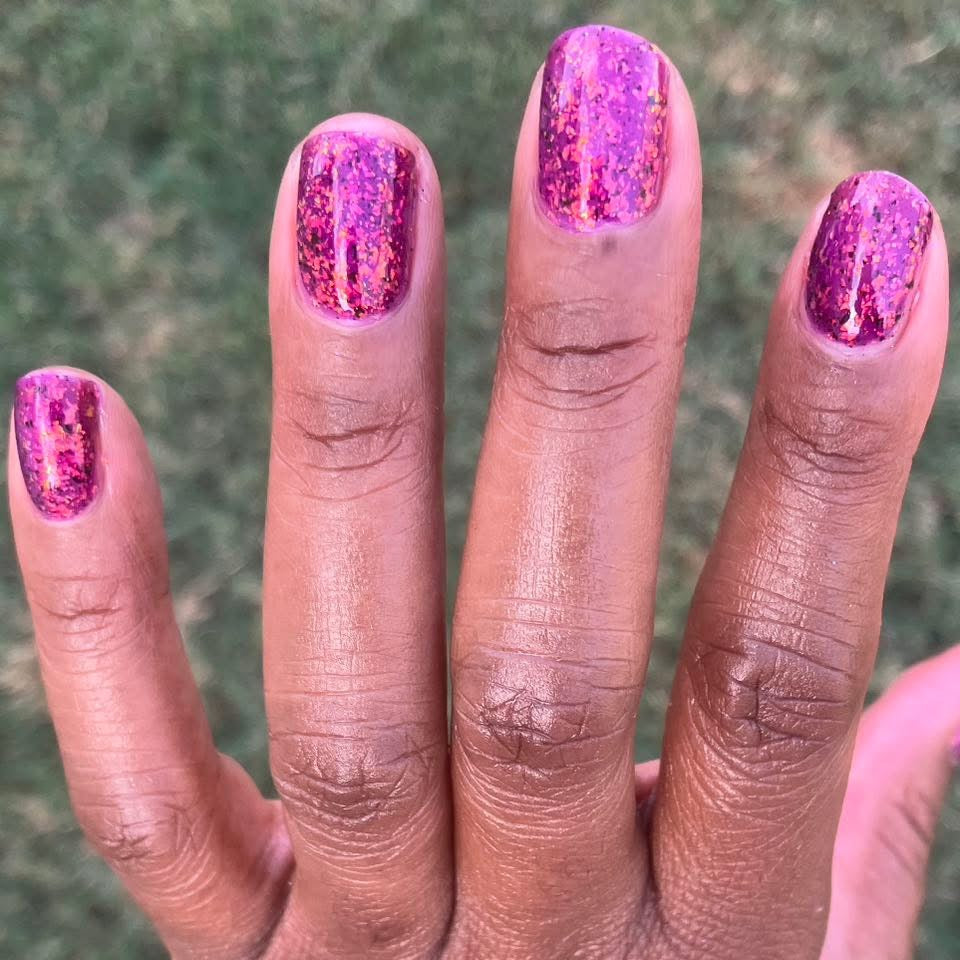 purple jelly base with orange/gold iridescent flakes and black flakes, photo shown in 2 coats