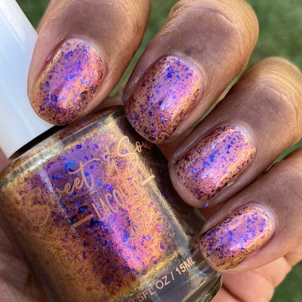 gold/pink/green shimmer base with blue/purple/ red multichrome flakes, photo shown in 2 coats