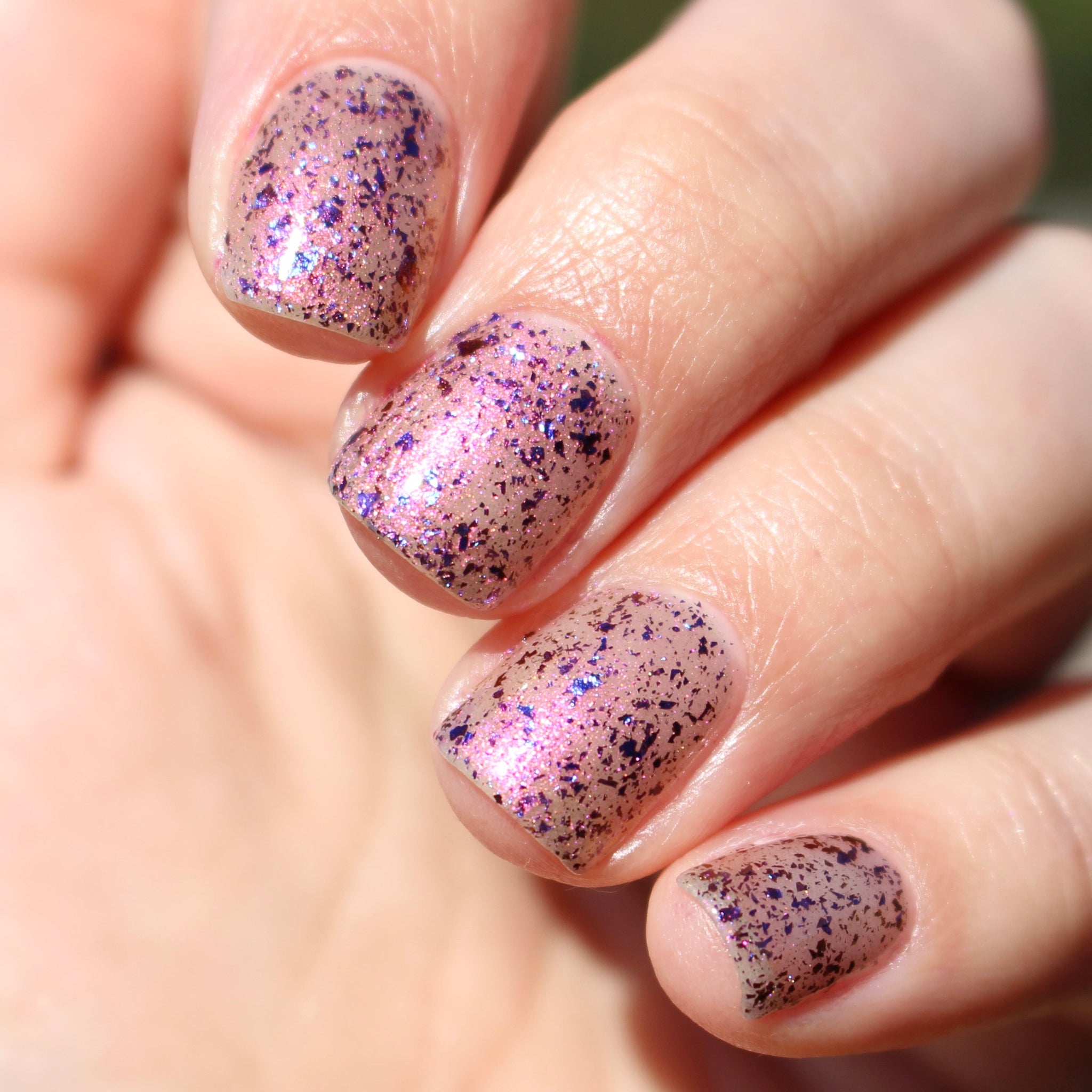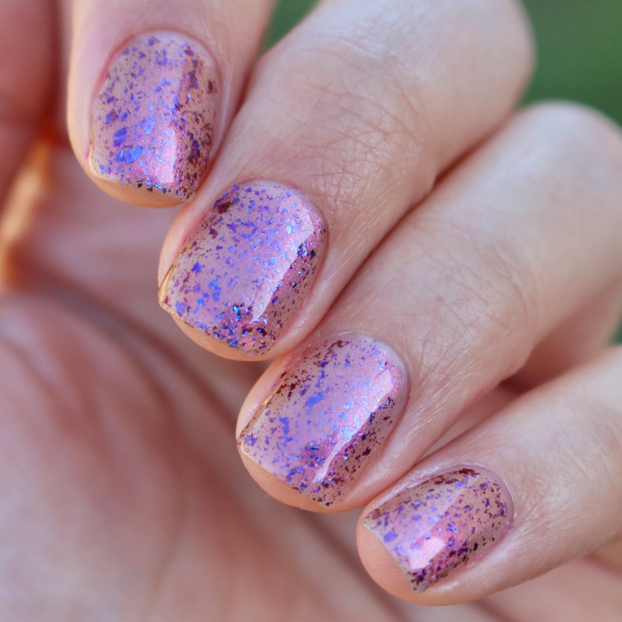 gold/pink/green shimmer base with blue/purple/ red multichrome flakes, photo shown in 2 coats