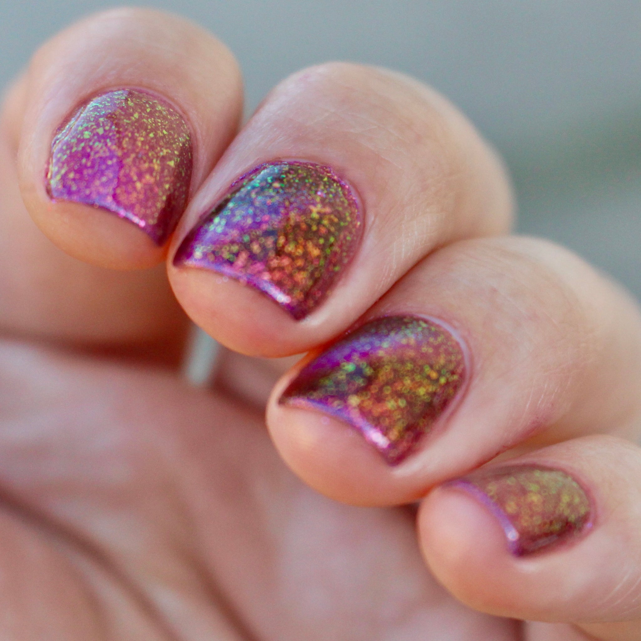 dark purple/blue magnetic in a berry red base, with small pink/orange/gold/green iridescent flakes, photo shown in 2 coats